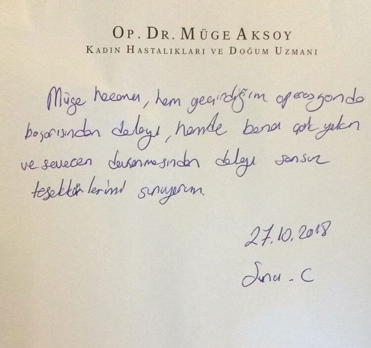 Müge hocama, hem geçirdiğim vajina daraltma operasyonun başarısından dolayı, hemde bana çok ve sevecen davranmasından dolayı sonsuz teşekkürlerimi sunuyorum.
