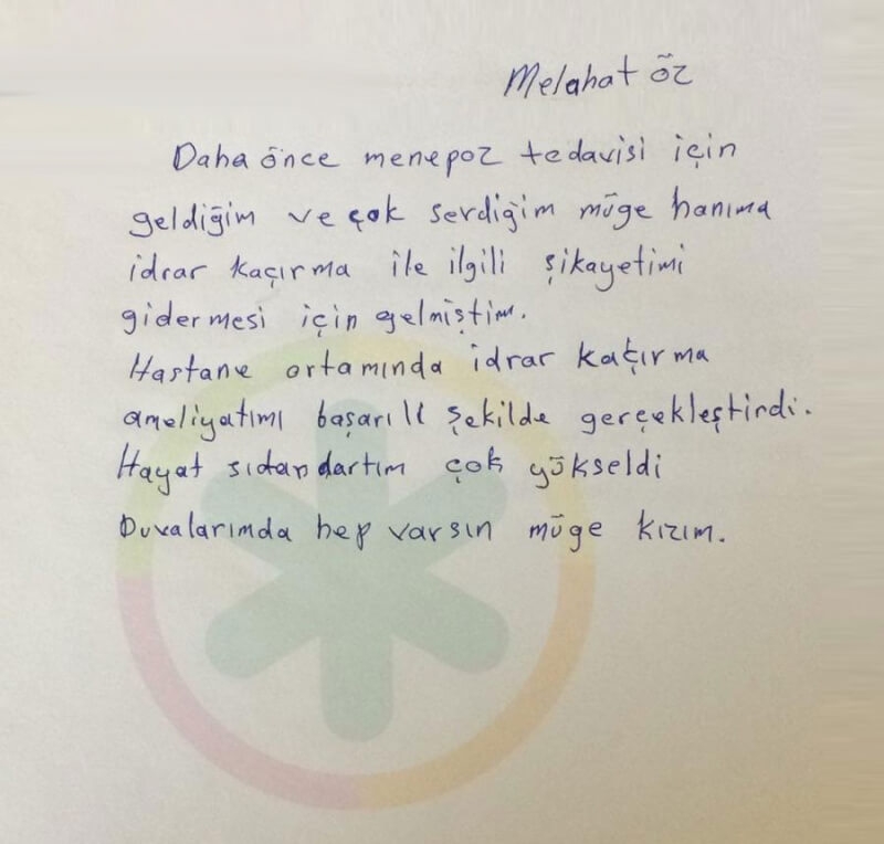 Daha önce menopoz tedavisi için geldiğim ve çok sevdiğim Müge hanıma idrar kaçırma ile ilgili şikayetimi gidermesi için gelmiştim. Hastane ortamında idrar kaçırma ameliyatımı başarılı şekilde gerçekleştirdi. Hayat standartım çok yükseldi, dualarımda hep varsın Müge kızım.
